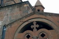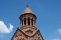 |  | Ejmiatsin Cathedral Compound Ejmiatsin is the center of the Armenian Church. It is where the Catholicos Of All Armenians lives, and the location of Ejmiatsin Cathedral. The cathedral, built in 480, is located in a walled compound with gardens and various structures. Ejmiatsin means The coming of the only-begotten because it was built were people said Jesus Himself descended from heaven to show where He wanted a church built. It is a scenic place to visit. The main church structure is pretty large, however the majority of the interior is dedicated to uses other than worship and the area you enter is much smaller than the size of the entire building. It is a traditional Armenian design with a belfry and a number of rotundas. Most of the exterior is plain until you make it around to the entrance which is intricately carved and very beautiful. You must not leave until you get into the Manougian Museum. (Entrance through the large arch across from the cathedral entrance) This structure contains numerous cool paintings, souvenirs, religious artifacts, and illuminated manuscripts so insist on seeing it. Another secret is a fire pit beneath the altar. This is where pagans worshipped fire before Christianity. It is in the small museum in the main cathedral, with the entrance to the right of the altar. There are some religious artifacts in display cases, but you usually need to ask to be shown the fire worshipping pit, at which time a small donation is hinted at. Above the door which descends into the fire pit area is the lance ("Geghard") which is said to have pierced Christ's side. The original structure was added to so much over the years that not much remains now. There was an even earlier church on the same site which was supposed to have been built when Armenia was converted to Christianity. Ejmiatsin was however the oldest church in the USSR. Make sure to wander around the gardens to get a look at the carvings and khatchkars. There is a nice gift shop by the entrance to the compound. The traffic square adjacent to the compound is ringed with very nice models of some Armenian churches throughout the country.